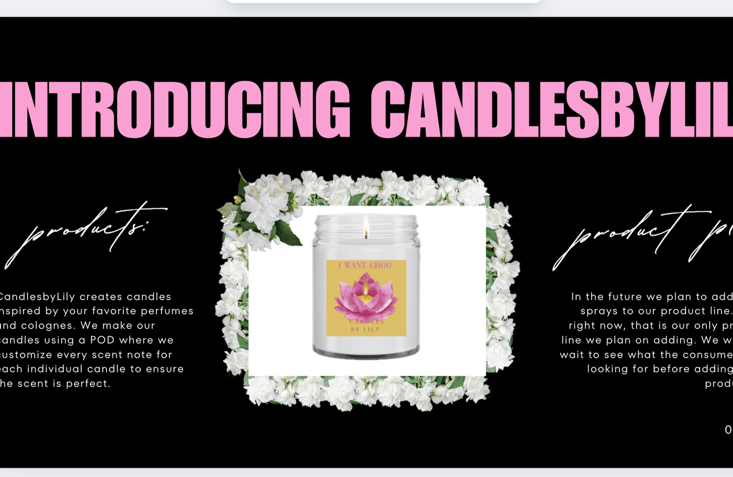 Candles by Lily is a candle company that specializes in candles that smell like perfumes and colognes. The idea behind the company was to have a candle scent that matches a person/place/ or even feeling. If a loved one passed away, you would be able to order a candle in the scent of their fragrance. An awesome way to feel close to somebody.