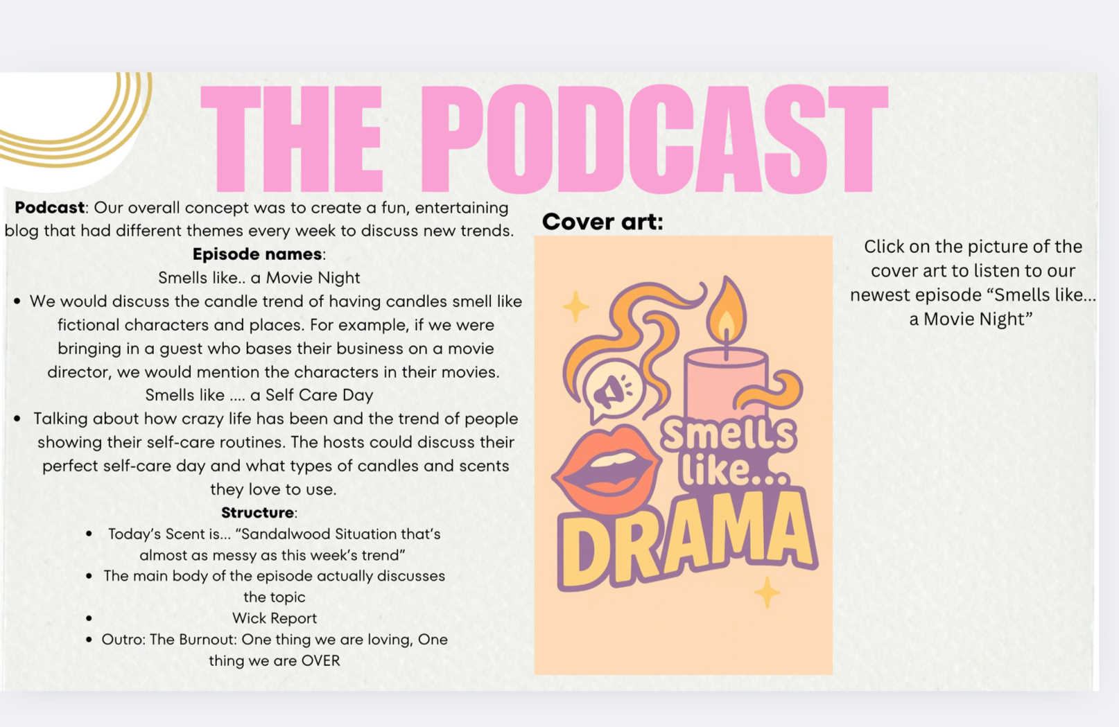 This project took place over an entire semester where each week we began a different step for our company. The first thing we did was come up with over 100 different ideas to then chose from for our brand. Then we worked with POD suppliers to create the product itself. We created our own logos and websites to help promote the products. We then teamed up as category related groups, and created a podcast. I worked with three other girls and created a podcast called, “ Smells like drama”, where we dove into different topics and related it all back to our companies. Finally, we created elevator pitches that showcased our entire company, from customer portfolios, to the ask at the very end. This class was amazing, and it was very fun to learn about how much goes into creating a company from the ground up.